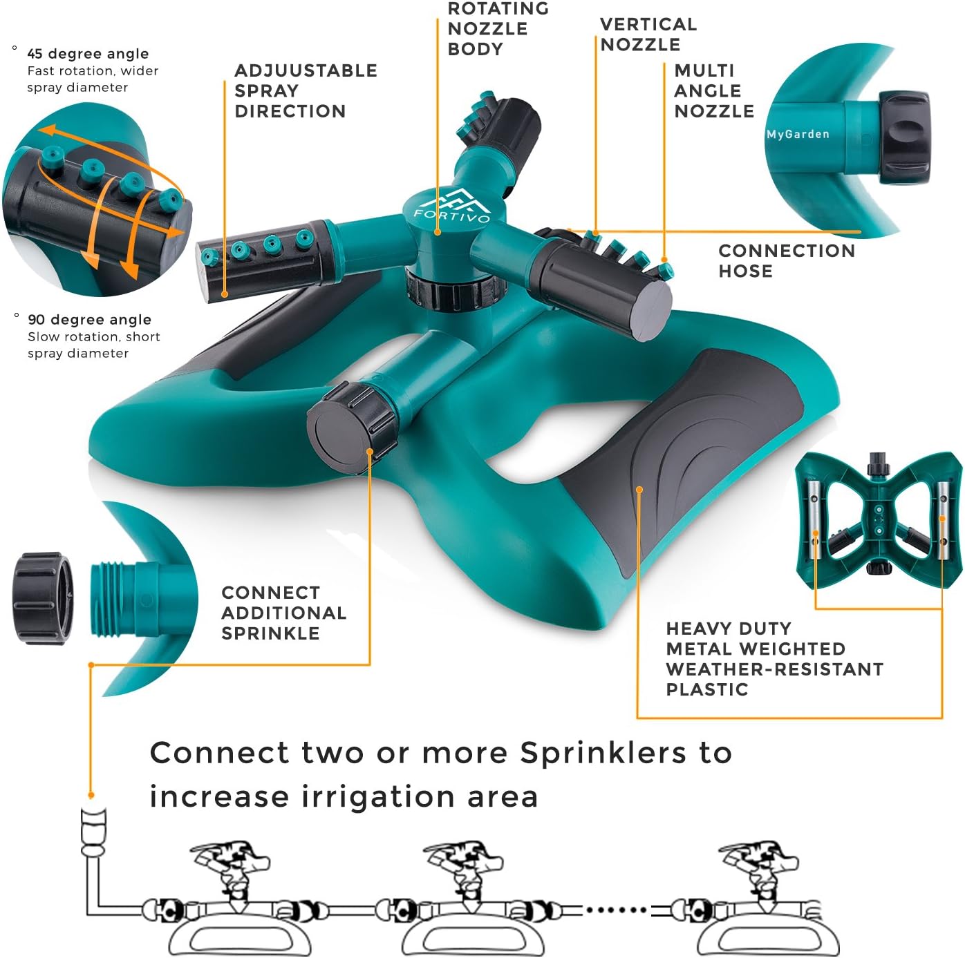 Lawn Sprinklers for Yard - Our yard water sprinkler is US hose compatible (99%) and has an adjustable 3-arm sprayer that rotates 360 degrees for customized spray patterns. Choose 90 degrees for compact watering or 45 degrees for larger areas.